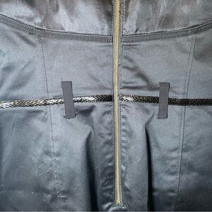 This is a designer Zac Posen NY black mini dress from the Z Spoke line, featuring thin straps, a front slit, and a corset-like top. It is a size 10 and made of a blend of lycra, cotton, and rayon. The dress has a scoop neckline and a zipper closure, perfect for occasions like parties, formal events, or work. It has a chic and edgy style with accents like a faux crocodile waistline. Great for summer, fall, or spring wear.