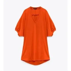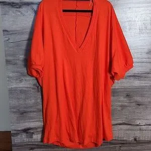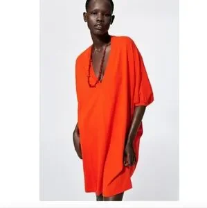 Bright orange cocoon dress is 100% cotton with oversized, slouchy fit. Deep v neck, short dolman sleeves. No signs of wear. Bust is approx 23 inches, length is approx 35 inches. Excellent condition.