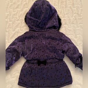 Vintage La Petite by Rothschild hooded coat with black textured velvet flocking detail. Faux fur trimmed hood, velvet lined hood, hidden zipper closure with snap placket, attached mittens that snap on at wrists, front velvet trimmed pockets, and velvet bow details on front and back of coat.