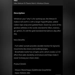 Men’s Nike Metcon 9 Team shoe in black and Vegas gold. Worn once, excellent condition! See website description of shoe in images. Mens size 11.5. Bundle for a discount! 👟