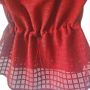 Akris Punto Perforated Adjustable Waist Short Sleeve Hi-Low Peplum Top, Red