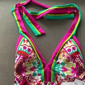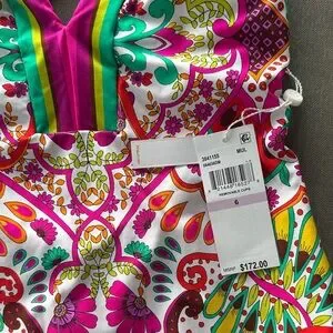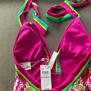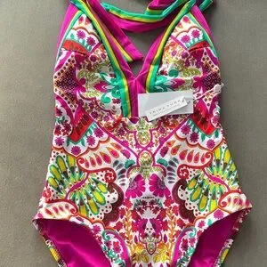Stylish swimsuit by Trina Turk. Features vibrant pink and green patterns with intricate designs.