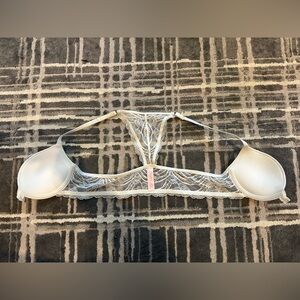 Chic white lace bra with racerback design. Offers style and support. New without tags. Only tried on.