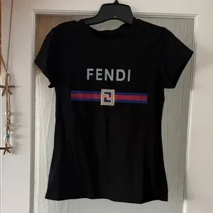 Stylish Fendi tee with bold logo. Features red and blue stripe detail. Perfect for casual wear.