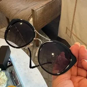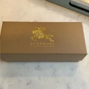 Stylish Burberry sunglasses with a sleek black frame and gold accents with the signature Burberry check. Small scratches but don’t deter from overall beauty of these and reflected in pricing. Perfect for a modern look. Comes with Burberry leather magnetic closure case, Burberry cleaning cloth and Signature gold foil box they came in.