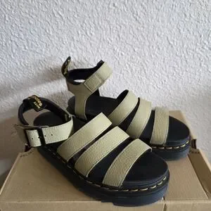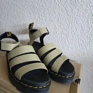 Stylish Dr. Martens sandals with olive green straps. Features a comfortable black sole.