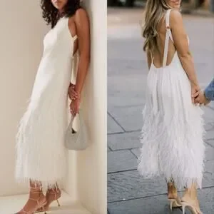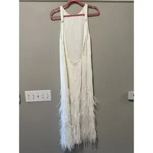 Cult Gaia Aja Gown Feather Midi Dress in Off White. Size 10. Features pearly crepe fabric ornamented with cascading wispy feathers, sleeveless, open back with ring hardware, concealed back zip closure, high neckline, long midi length, Fabric: 100% viscose Trim: 100% ostrich feather. New without tags, never worn. Retail $1,698.