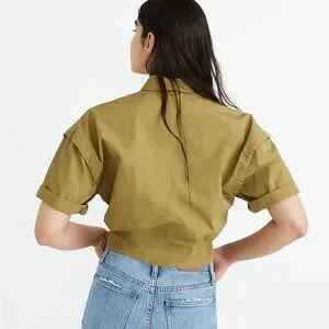 Size medium. Madewell olive button down shirt. Features short sleeves and classic collar. Perfect for casual wear. Cropped fit.