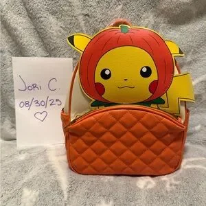 Cute Pikachu backpack with a pumpkin design. Features vibrant orange and yellow colors.