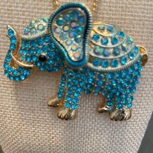 Charming Betsey Johnson elephant pendant necklace in vibrant blue and gold. Perfect for adding a playful touch to any outfit.