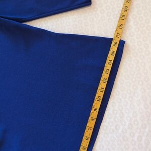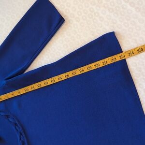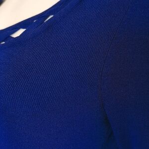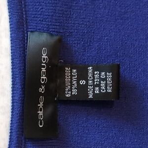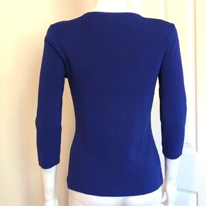 Beautiful deep blue/purple color, 3/4 sleeves, intricately woven criss-cross detailed neckline. 62% viscose, 38% nylon blend, medium weight knit fabric, comfortably fitted.