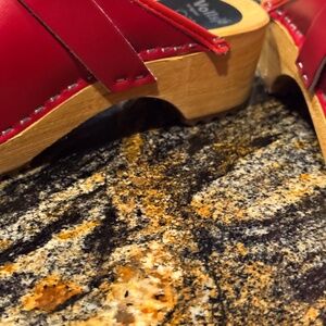 Wooden and red leather new clogs never worn. Please look at all photos and see inside as you will see wood grading that looks like foot shape. This is NOT foot wear but grading from wood pattern. These are easy slip on shoes and fun for all season. Euro size 38 American 8 but I will say snug 8.