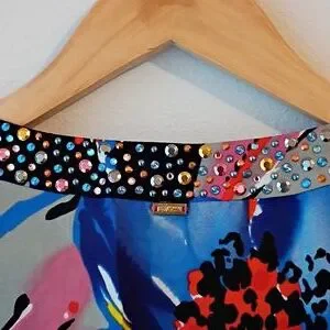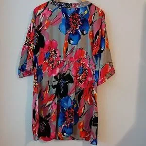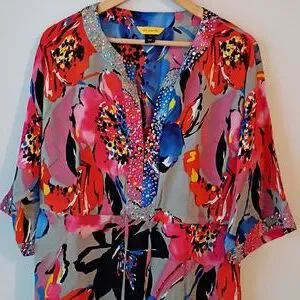 Elegant dress with bold floral pattern. Features vibrant colors and a sleek design.