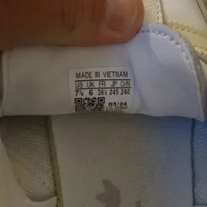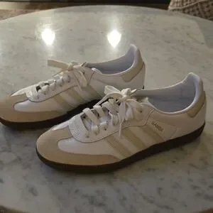 Classic Adidas Samba sneakers in white and beige. Comfortable and stylish for everyday wear. US 7 1/2