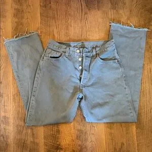 Classic Levi's straight leg jeans. Light gray color. Frayed hem for a trendy look.