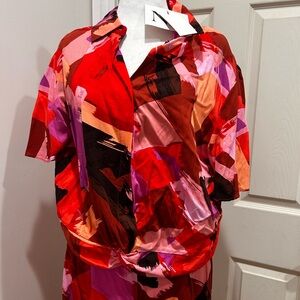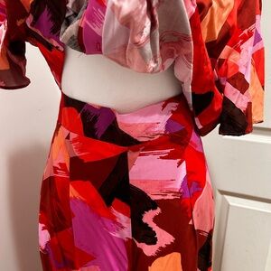 Make a bold statement with this vibrant red abstract jumpsuit. Perfect for any occasion, its eye-catching design ensures you stand out.