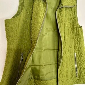 Olive green vest with quilted design. Features a sleek front zipper & zippered pockets. Fully lined, very versatile, excellent condition. Ideal for layering. Due to my weight change I cannot wear so hopefully you can enjoy this vest.
