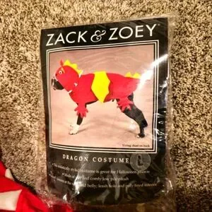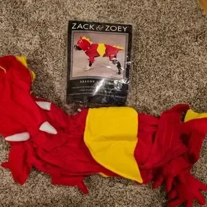 Dress your pup in this colorful dragon costume. Bright red and yellow design. Perfect for Halloween and playtime adventures. This was worn once for a few minutes and is clean. This is the large size, check out the pictures for what the suggested breed size is for a large.