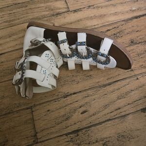 Chic white sandals featuring blue buckle details. Ideal for a trendy look.