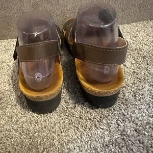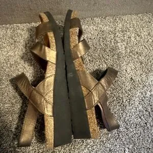 Elegant metallic brown sandals by Naot. Features a sleek and comfortable design. Ideal for everyday wear.