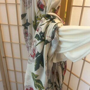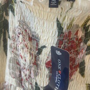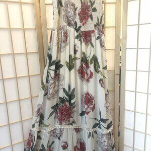 Beautiful, gauzy, comfortable One Clothing floral maxi dress! Cream colored base with colorful floral print, shirred bodice, adjustable camisole straps, tiered flowy skirt. Cream-colored, stretchy slip liner extends to the top of the legs; the rest of the skirt is unlined. Fabric: 100% Rayon (care: hand wash in cold water; lay flat to dry, cool iron if necessary). Liner is 100% polyester. Never worn; still has tag attached.