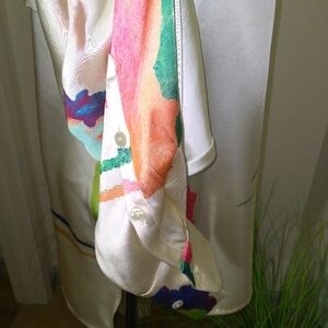 Elevate your style with this chic abstract print blouse.Featuring a blend of vibrant colors, it's perfect for making a statement. Ideal for any occasion. Perfect match with the Steve Madden Green Block Heels listed in my closet