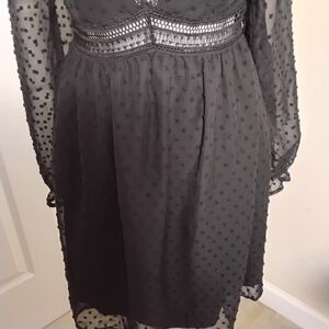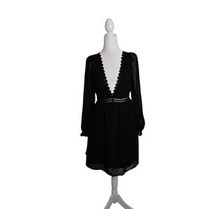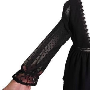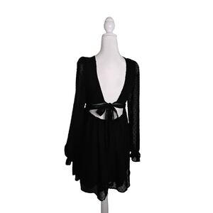 Shein Women's Black Scheer Deep V-Neck Long Sleeve Swiss Dot Tie Mini Dress L