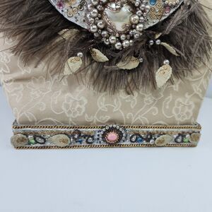 Crafted from quilted silk in an elegant champagne beige tone, it is richly embellished with multicolor rhinestones, faux pearls, intricate beadwork, and feather accents. The signature oversized circular handle is fully jeweled, creating a dramatic and unique design that sets this purse apart.