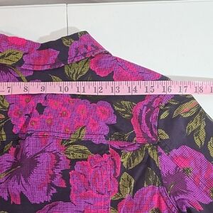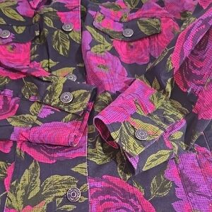 Good used condition. Approximately 23" total length, back neck to bottom excluding collar. Sleeve approximately 17 1/4", under pit to end. Button front. Slash pockets, chest pockets. Colors: purple, pink, green, black.