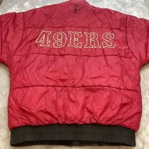 The zipper pull is missing and there are a couple minor discolorations. It looks like there was a detachable hood at one time, but it is missing. In otherwise great vintage condition with little to no signs of wear. Please confirm measurements, as I had to guess on the size since there are no labels. Great jacket for the 49ers collector!