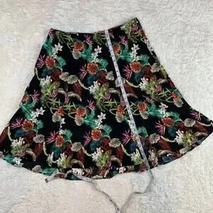 Midi skirt in a black and tropical print. Not much for stretch, with side zip closure.