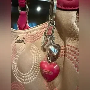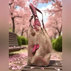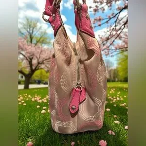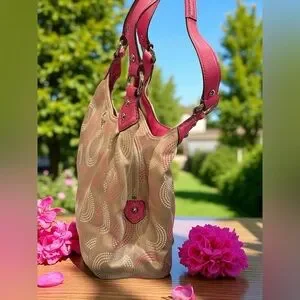 Stylish and elegant, this Coach bag features a beautiful pink and cream design. Perfect for any occasion, it combines fashion with functionality.