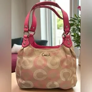 Coach F21920 Op Art Dotted Ashley Hobo Shoulder Handbag Khaki Pink Purse. Comes with key chain and coach branded dust bag. Pre-owned condition. There are a few spots on the fabric. The Coach hangtag is missing, but I’ve added a much more expensive Coach Branded Key Chain to match. The inside liner is clean. Please see photos for detailed condition.