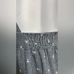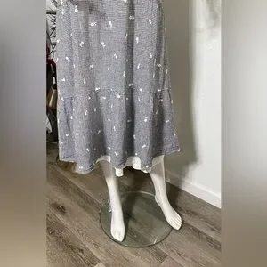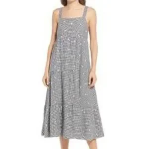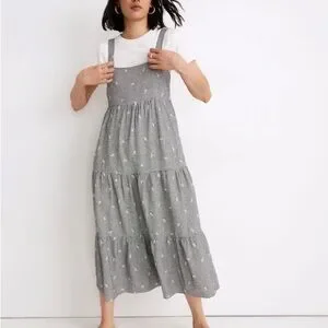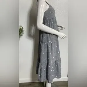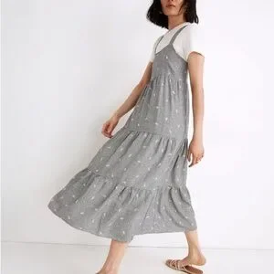 Elegant gray midi dress with floral print. Features tiered design and sleeveless style.