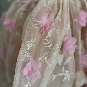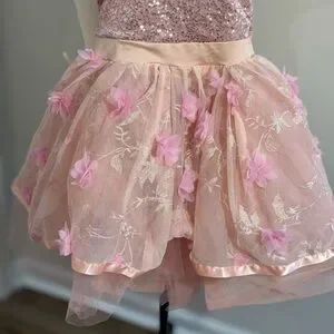 Sparkling pink bodice with floral accents. Cream straps and skirt overlay. Perfect for special occasions.