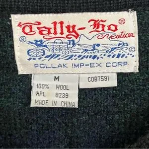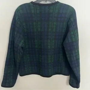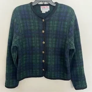 Tally-Ho Women's Size Medium Cardigan Wool Sweater Gold Buttons Plaid Green Blue