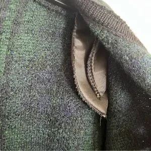 Women’s Vintage Tally-Ho Creation 100% wool green and blue plaid cardigan sweater with floral patterned gold buttons and black trim