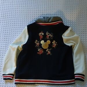 Charming hoodie with Mickey Mouse design. Features black body, cream sleeves, and red accents. Ideal for Disney lovers.