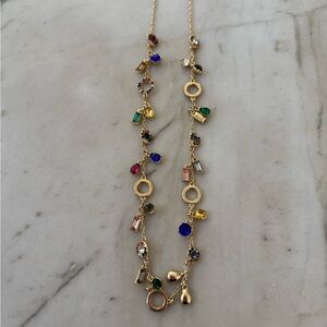 Chic gold necklace adorned with vibrant gemstones. Features red, blue, green, and yellow stones. Ideal for any occasion.