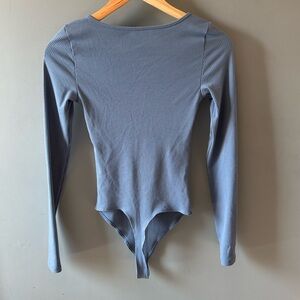 American Eagle blue ribbed bodysuit. The bodysuit is long sleeve with a bottom down front. The bodysuit has a scoop neckline. The bodysuit is a thong style with two buttons. The bodysuit is fitted.