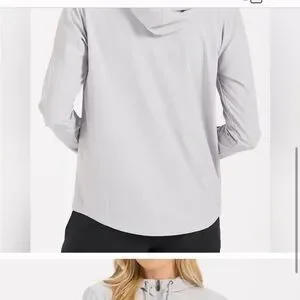 Light shell jacket excellent used condition. No stains. One drawstring side is slightly worn.
