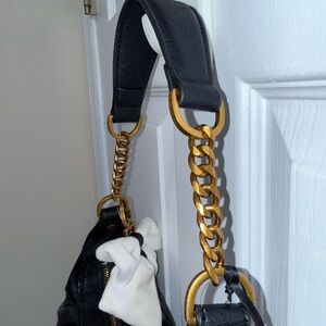 Viral Chic black shoulder bag with gold chain strap. Features a stylish emblem and a cute bow detail. Perfect for adding elegance to any outfit.