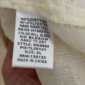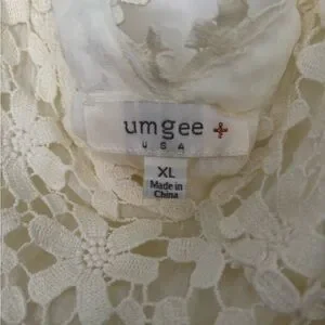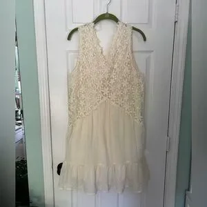 Umgee sleeveless, V-neck, cream/ivory dress with floral lace design. Can be dressy or add Jean jacket for casual wear. Like new condition. Cotton and polyester. Lightweight. Size XL. Fits true to size. 37” long (shoulder to bottom hem). 23” armpit to armpit.