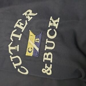 Stylish navy pullover by Cutter & Buck. Features logo on sleeve.