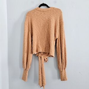 Chic knit sweater with front tie detail. Features long sleeves and ribbed texture. Ideal for layering.