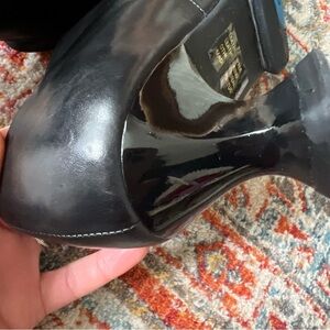 Mary Jane style with heels. Curvy design with a cut-out detail. Oblique-shaped toe. Side buckle closure. Glossy black heel with a thermoplastic rubber (TPR) heel lift. Leather upper, insoles. TPR outsoles. Made in Portugal.