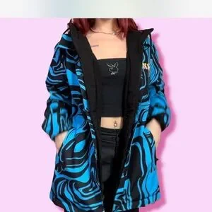 Bold ski jacket with a playful cat and mushroom design. Eye-catching style for the slopes.