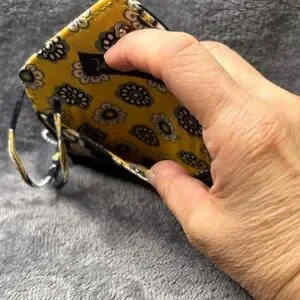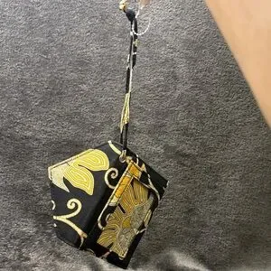 Stylish wallet with bold floral pattern. Features a clear ID window. Compact and functional design.