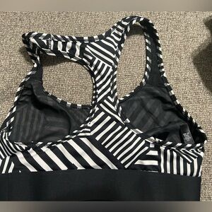 Stylish sports bra with black and white stripes. Perfect for workouts.