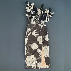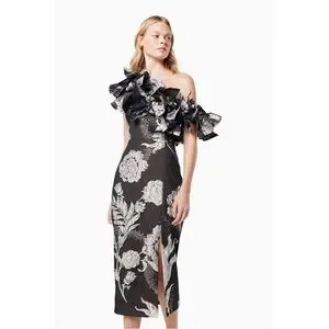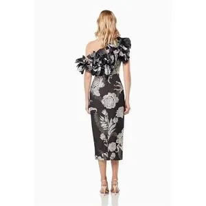 Elegant midi dress with floral design. Features ruffled neckline. Perfect for special occasions.